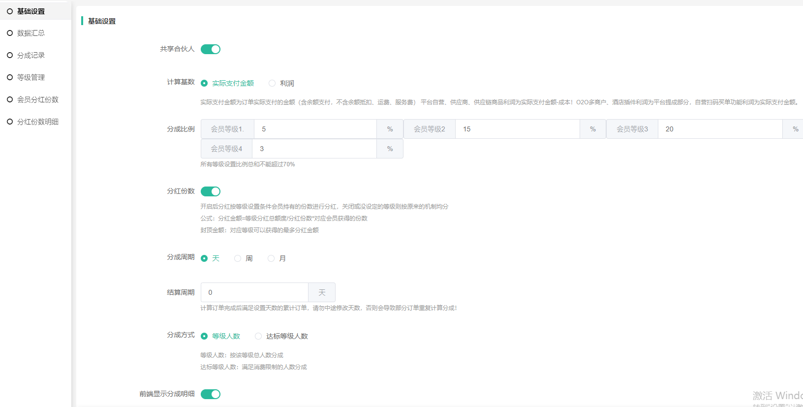 6、设置结算周期:订单完成后满足结算期才会计入到分红池。结算周期是订单完成时间 + 结算周期天数,比如结算天数1天,8号11点完成的订单,9号11点达到结算周期,在10号0点的时候计入分红池结算