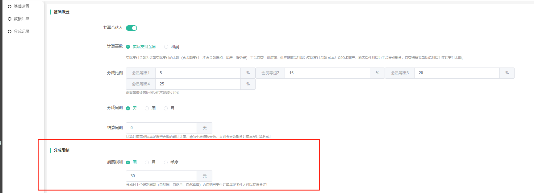 5、选择分成周期:天是每天0点,周是每周一0点,月是1号0点。