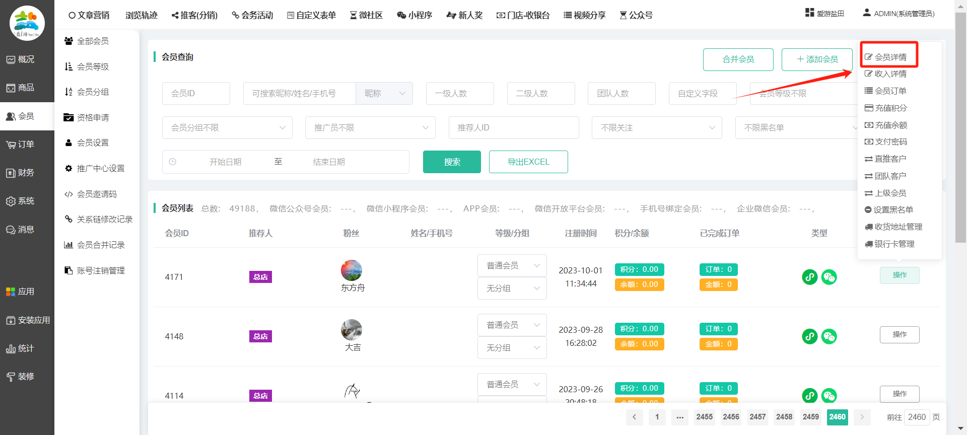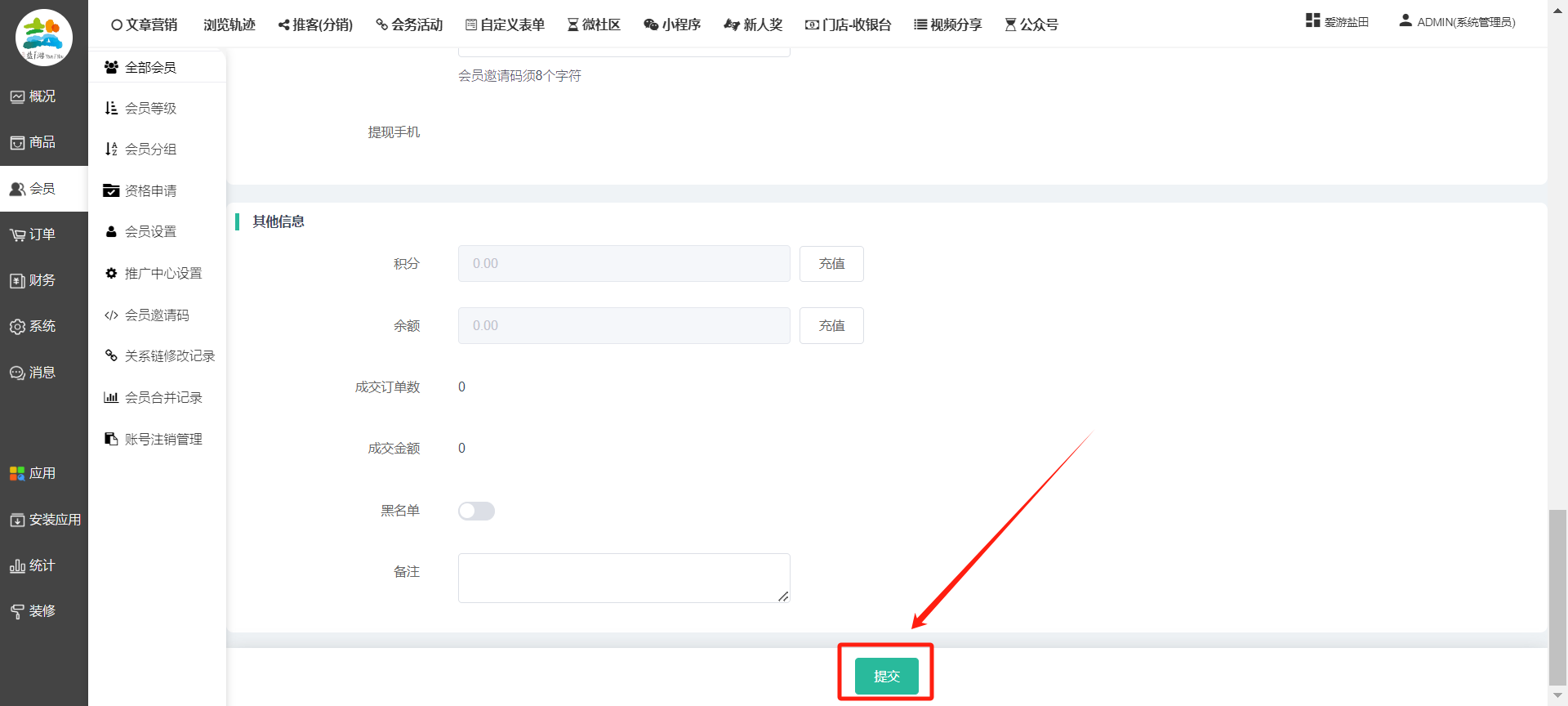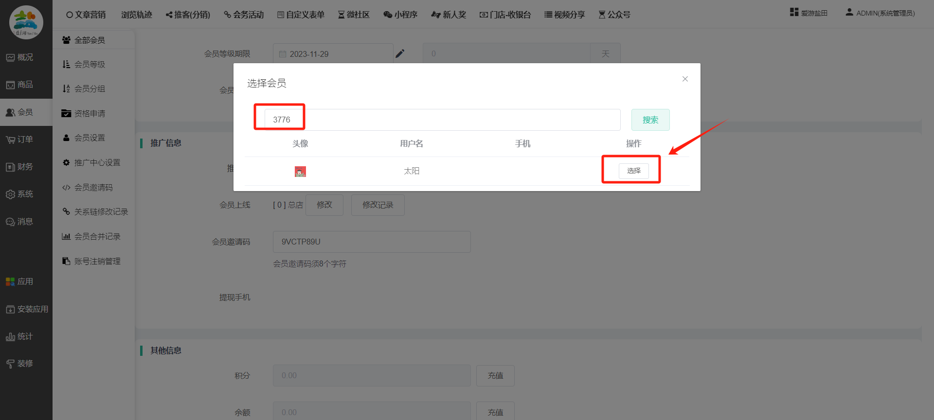 目录 搜索 展开 一、前期准备资料二、数字乡村码-上线操作指南1、服务号的申请流程及认证2、申请小程序流程3、开放平台绑定小程序和公众号三、数字乡村码-系统操作数字乡村码系统管理-概况数字乡村码-商品管理1、发布商品2、商品列表3、商品表单4、商品分类5、品牌管理6、配送模板7、评论管理8、优惠券管理9、商品标签10、退货地址设置11、满额优惠12、批量操作13、配送方式14、基础设置15、商品隐藏四、数字乡村码-会员管理1、全部会员2、会员等级3、会员分组4、资格申请5、会员设置6、推广中心设置7、会员邀请码8、会员关系链修改关系链修改记录9、会员合并记录10、账号注销管理11、会员设置中心五、数字乡村码-订单管理1、订单管理列表2、订单处理流程3、订单状态4、订单修改价格5、订单退款退货6、多包裹发货7、批量发货订单操作步骤8、催发货订单9、物流查询六、数字乡村码-财务管理1、余额设置2、会员余额3、充值记录4、转让记录5、余额明细6、收入明细7、提现设置8、提现统计9、积分管理10、转账审核11、收益广告12、批量充值七、数字乡村码-系统管理1、商城入口2、商城设置①、商城设置②、订单设置③、物流查询④、短信⑤、联系方式⑥、分类⑦、优惠券⑧、分享⑨、幻灯片⑩、广告位⑫、地图设置3、交易设置4、微信模板消息自定义消息模板(新版)自定义消息模板(旧版)小程序消息模板公众号模板消息变更公告5、语言设置6、权限管理7、多媒体管理八、数字乡村码-消息管理九、数字乡村码-应用管理十、数字乡村码系统-数据统计十一、数字乡村码-页面装修DIY1、模板管理2、店铺页面3、顶部导航4、底部导航5、DIY模板市场6、首屏广告7、基础设置8、装修DIY尺寸建议十二、供应商功能插件操作指南1、供应商2、门店-收银台门店申请和使用步骤门店管理①、门店-收银台 营销设置②、门店-收银台 分润设置门店分类门店申请门店审核门店商品门店商品订单收银台订单数据统计核销员基础设置默认设置门店装修3、微社区4、会务活动十三、营销插件操作指南活动报名提货卡新人奖微店问卷调查积分视频分享1、视频分享基础设置2、视频分享发现管理3、视频分享分类管理4、视频分享评论管理5、视频分享分红记录6、视频分享短视频中心每日红包幸运大抽奖签到优惠券二维码任务奖励优惠劵文章音频文章付费文章限时购新海报拓客卡操作流程积分活动素材中心视频红包十四、入驻门店应用类1、门店预约2、附近商品3、门店定位设置4、门店控制5、门店满额包邮6、门店满额减7、导入商品8、门店搜索9、门店股东10、核销券11、多门店核销1、商城后台设置2、前端功能演示十五、常见问题1、后台登录密码修改流程2、会员-余额,积分,后台如何进行充值与扣除3、如何修改上下级关系4、一种万能的获取商城小程序路径的方法 暂无相关搜索结果! 阅读次数:1521 本文档使用 模王系统 发布 8、会员关系链修改 8、会员关系链修改一.如何修改上下级关系?1.会员-全部会员-可以通过搜索用户的独立ID,或者用户微信昵称,找到此会员,然后点击右边的(操作)2.再点击会员详情。3.滑到下面,有个推广信息-会员上线,点击修改4.输入上级的ID号,点击搜索,出来此上级会员后点击选择。5.滑到最下面,一定要点击提交按钮。文档更新时间: 2023-11-30 14:56 作者:链上旅行